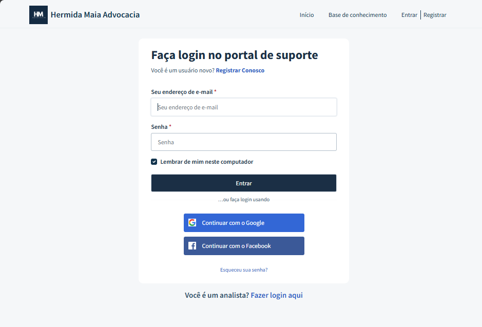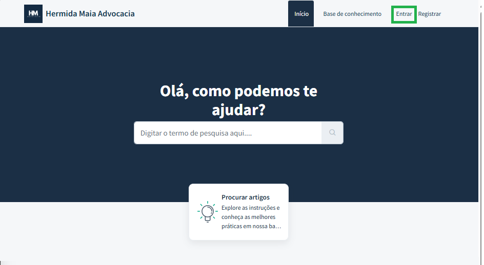 Usuários registrados podem clicar em "Entrar" no canto superior direito do portal de suporte.